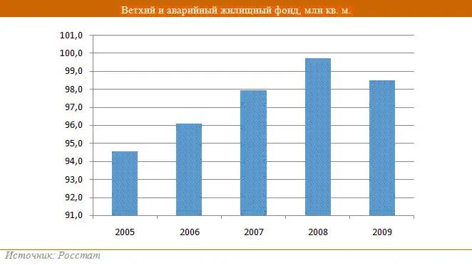 Помимо сокращения объемов ввода в действие жилой недвижимости, следует обратить внимание и на то, что ежегодно происходит процесс старения жилого фонда и убыль жилья. Убыль жилья - это процесс сноса ветхого и аварийного жилья. Объемы ветхого жилищного фонда в России представлены на следующей диаграмме.