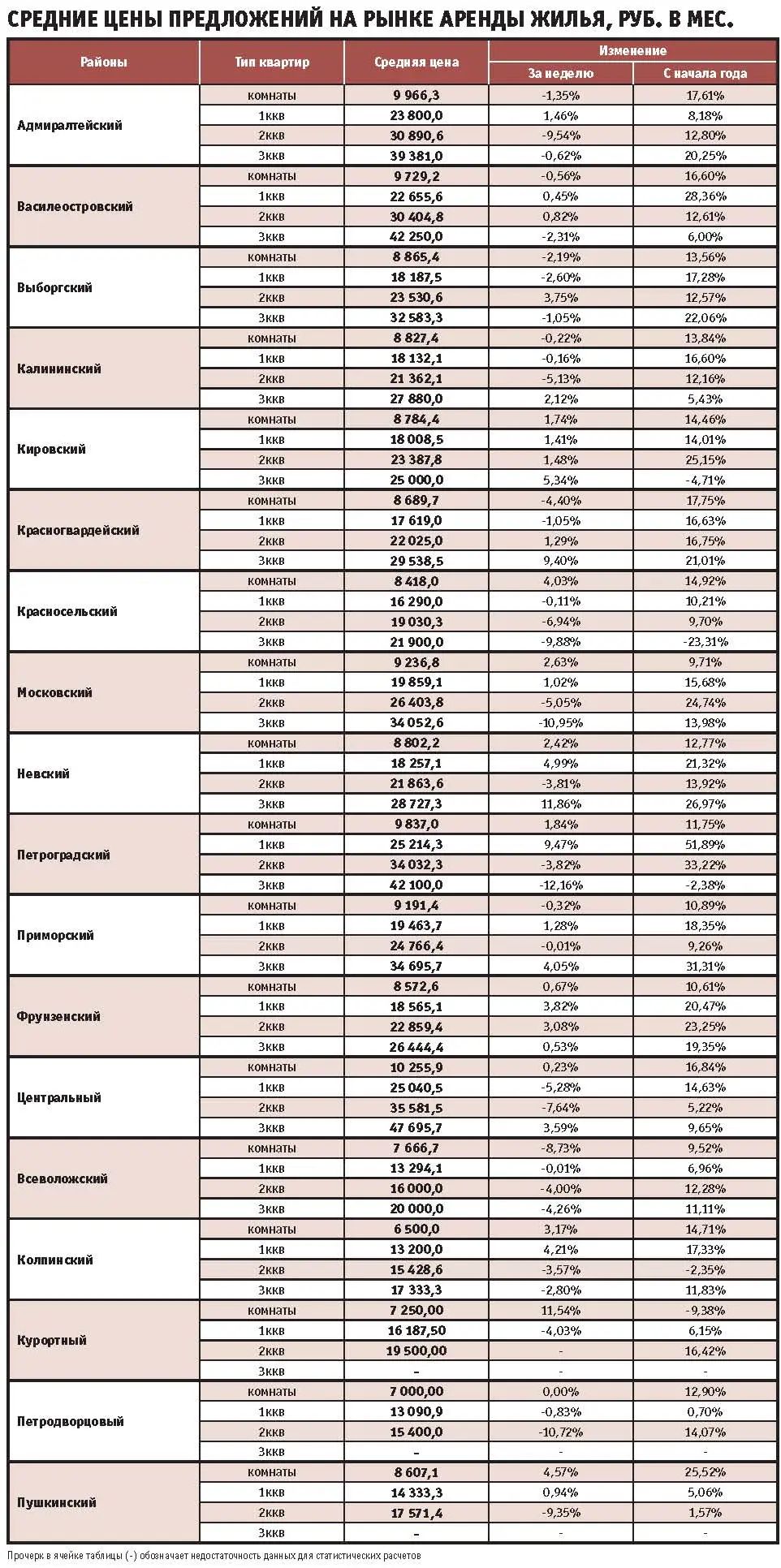 На прошлой неделе единственным районом, в котором арендные ставки на все виды квартир поднялись, стал Кировский. Однокомнатные варианты здесь подорожали на 1,41% (до 18 тыс. руб. в месяц), двухкомнатные – на 1,48% (до 23,3 тыс. руб. в месяц), а трехкомнатные – на 5,34% (до 25 тыс. руб. в месяц).
