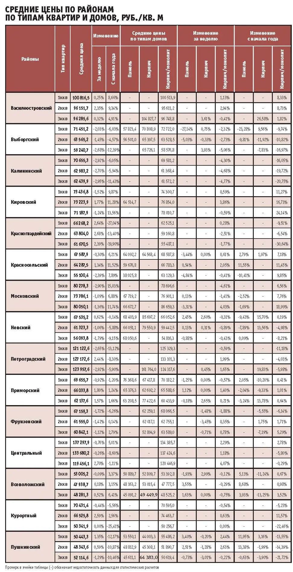 В целом колебания цен в районах Петербурга практически не ощутимы и не превышают 0,5–0,8%. Самые значительные изменения – в Калининском и Красногвардейском районах, причем изменения эти зеркально противоположны. Если в Красногвардейском стоимость жилья выросла на 2,97%, то в Калининском цена упала на те же 2,97%. При этом цена метра в обоих районах сегодня находится на уровне 64,9 тыс. руб.