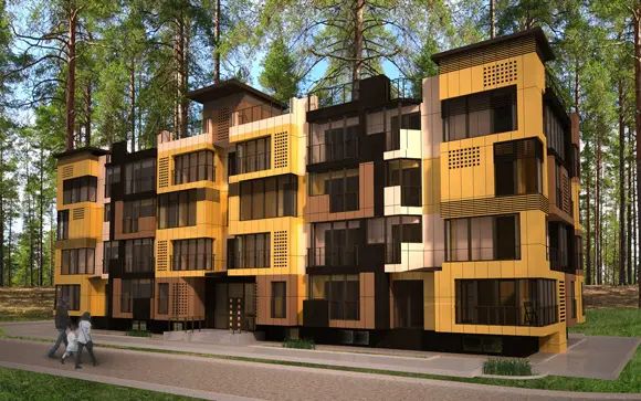 Половина из числа представленных проектов – быстровозводимые, на основе каркасно-панельной технологии: проект многоквартирного жилого дома «Невская дубровка» (на фото) ООО «HAUS-KONZEPT Содружество», многоквартирный социальный жилой дом «Вартемяги» от ОАО «Слотекс», проект быстровозводимого трехэтажного комбинированного дома от ДСК «Славянский» и проект дома из легких стальных тонкостенных конструкций ООО «Балтпрофиль». Как правило, в таких домах нет ни лоджий, ни балконов, ни полноценных технических этажей.