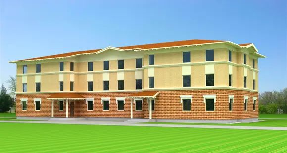 Собственно говоря, это и не совсем жилой дом, а общежитие квартирного типа на 9 квартир и 18 двухместных номеров с кухнями-столовыми на каждом этаже. И в этом отношении проект, предусматривающий широкую гамму фасадных отделочных материалов, выверен до мелочей. Приятное дополнение – выносные застекленные лоджии.