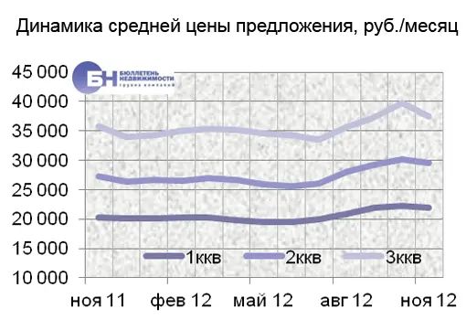 За минувший месяц изменение средней цены предложения на рынке аренды однокомнатных квартир составило минус 1,6%, средняя стоимость в ноябре 2012 года – 21,9 тыс. руб. в месяц. Двухкомнатные квартиры показали минус 1,8%, средняя цена аренды составила 29,6 тыс. руб. в месяц.