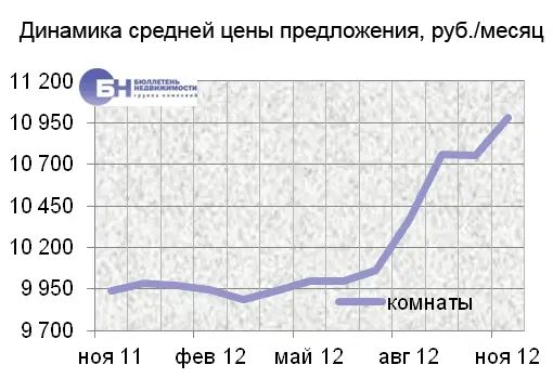 Стоимость аренды трехкомнатных квартир в Петербурге на конец месяца составила 37,5 тыс. руб. в месяц, что на 5,6% меньше сентября 2012 года. Средняя цена предложения комнат повысилась на 2,1%, стоимость аренды в месяц составила 11 тыс. руб.