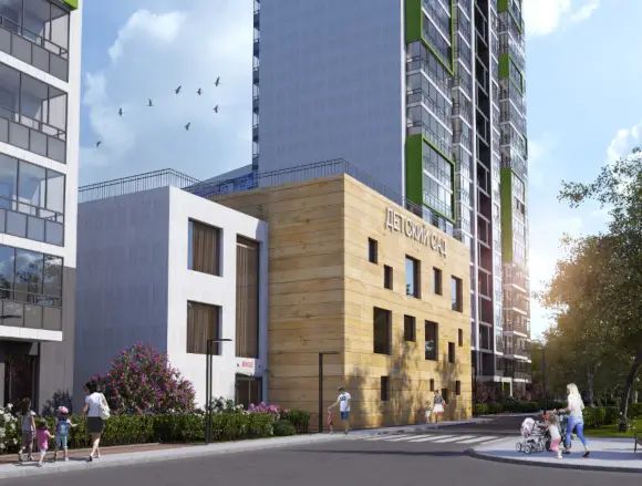 Встроенный трехэтажный детский сад разместится между первой и второй секциями дома. Общая площадь помещений дошкольного учреждения составит 1800 кв. м. Ввод объекта в эксплуатацию запланирован на II квартал 2021 года.