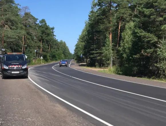 По заказу ГКУ «Ленавтодор» подрядная организация отремонтировала почти 20 км трассы, уложив два слоя нового асфальтобетона и нанеся разметку.