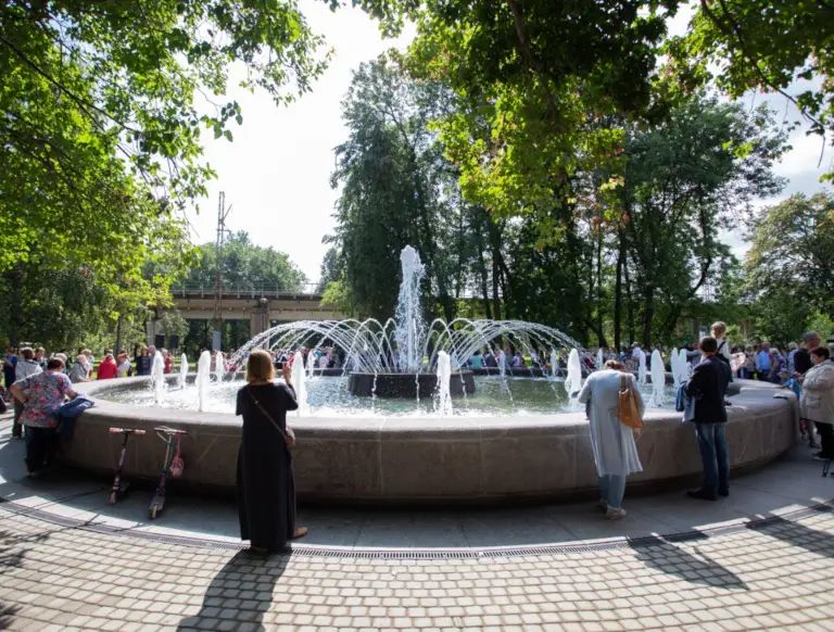 Обновленный фонтан оборудован энергосберегающей подсветкой и дополнительными насадками для формирования водной картины.
