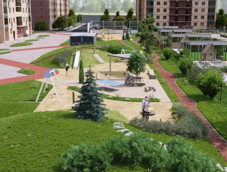 В 21 квартале между корпусами №5, 6, 7 и детским садом появится общественное пространство с прогулочной зоной. Соседи смогут отдыхать и общаться друг с другом на деревянных террасах, в беседках с навесами от дождя. Проектом предусмотрены прогулочные дорожки среди деревьев и шезлонги. Некоторые дворы будут закрыты для автомобилей, поэтому дети смогут играть рядом с домом с еще большим комфортом.