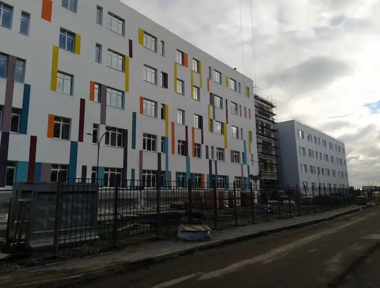 Готовность здания к настоящему времени составляет 75%. Работники компании «Дальпитерстрой» завершают устройство фасадов и отделку помещений. Уже оборудован школьный стадион.