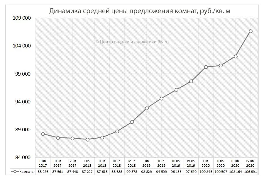 Показатель средней цены предложения на конец квартала составил 106,7 тыс. рублей за кв. м, то есть 1,783 млн рублей за комнату.