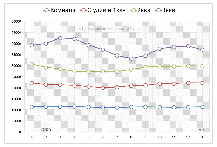 Аренда двухкомнатных квартир подешевела на 0,34%, средняя цена аренды составила 29,9 тыс. рублей в месяц. Стоимость аренды трехкомнатных квартир в Петербурге на конец января составила 37,3 тыс. рублей в месяц, что на 4,22% ниже, чем в декабре прошлого года. Средняя цена предложения комнат повысилась на 1,64%, стоимость аренды в месяц составила 11,6 тыс. рублей.