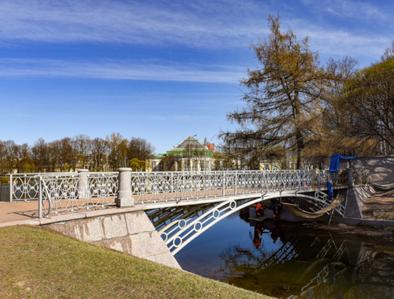 Пешеходный металлический мост был сооружен в 1793 году, он является объектом культурного наследия федерального значения. Длина переправы - 21,6 м, ширина - 3,7 м. Предыдущий ремонт моста проводился более 20 лет назад.