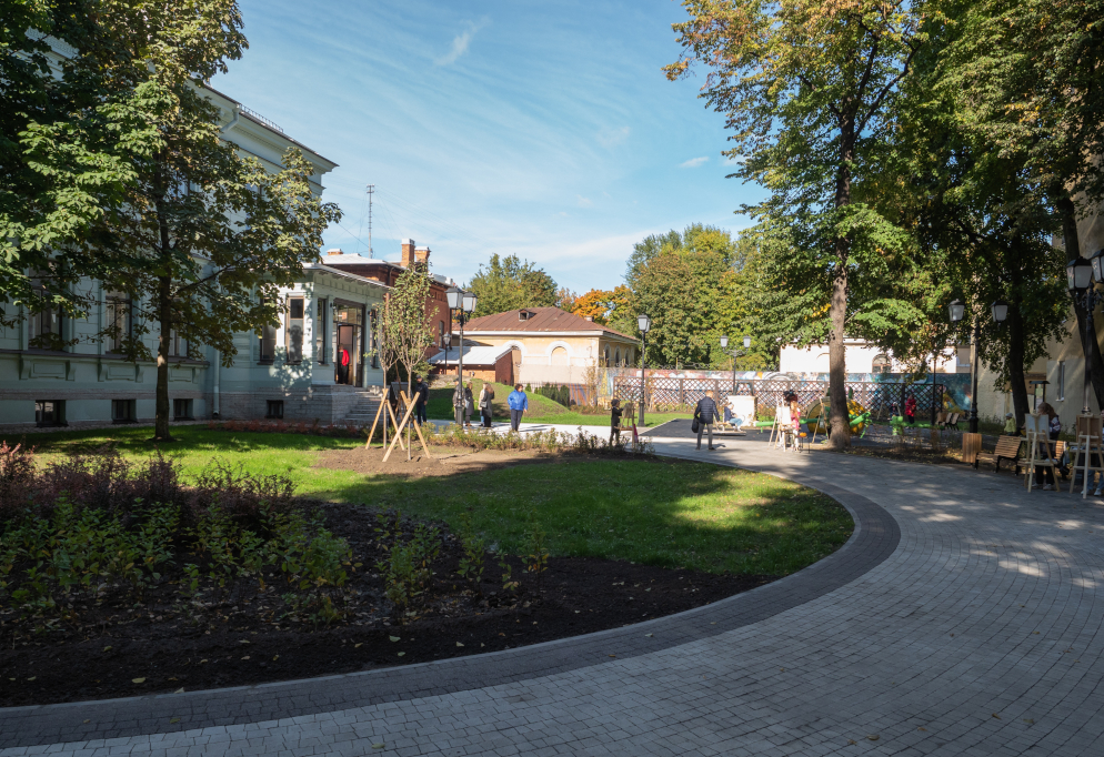 Комплексное благоустройство в сквере проведено на площади почти две тысячи квадратных метров. Разбиты газоны, появились мощеные дорожки, установлено ограждение. Высажено 17 деревьев и 879 кустарников. В саду появились фонари освещения. Плитка в сквере - аналог классической брусчатки, что подчеркивает историчность места.