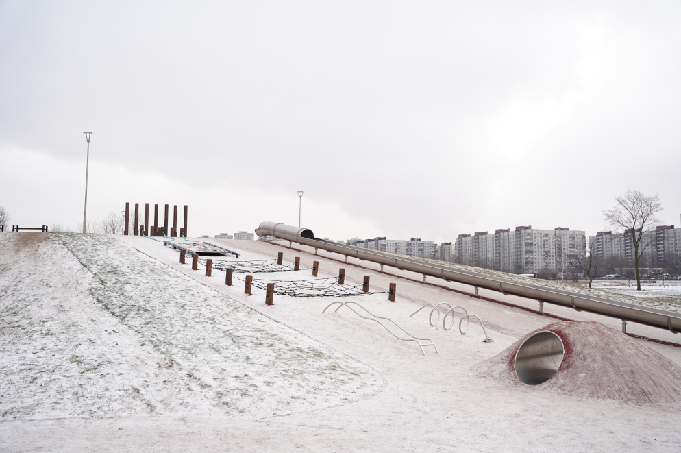 Один из акцентов второй очереди – искусственный холм, являющийся смотровой площадкой. С него открывается вид на всю территорию парка. На одной стороне холма обустроена катальная горка для детей.